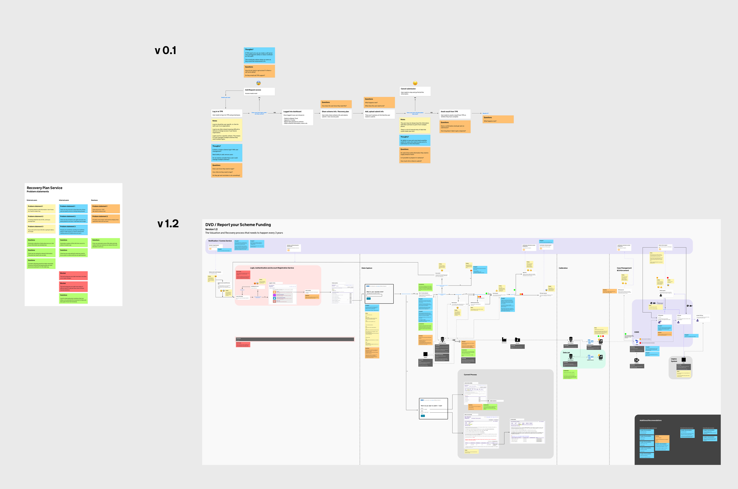 I mapped and made recommendations for service improvements that could be made iteratively. However, legislation was not completely finalised so requirements were constantly changing. The underlying technology was also being redeveloped, which existing services would be transitioned to in future so consideration needed to be given as to how they might benefit from this work. As such I looked at modular patterns that could be developed and reused for new services in addition to the Reporting of Scheme Funding service.